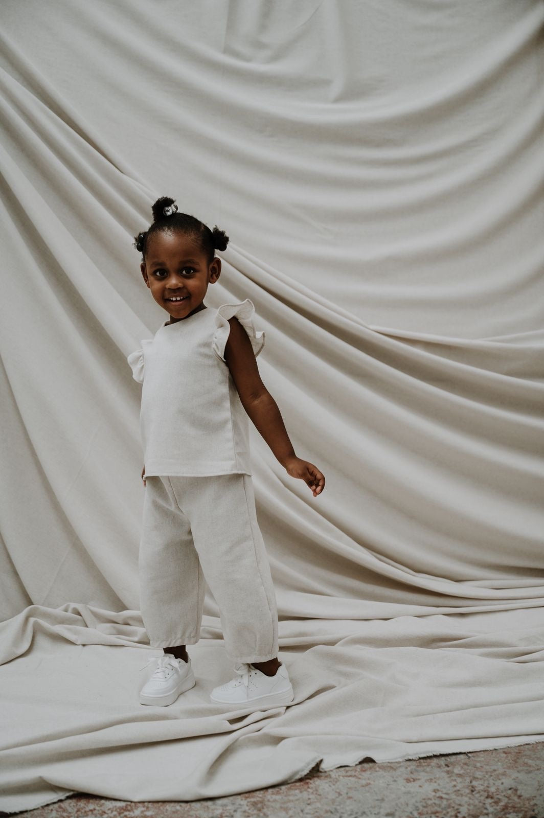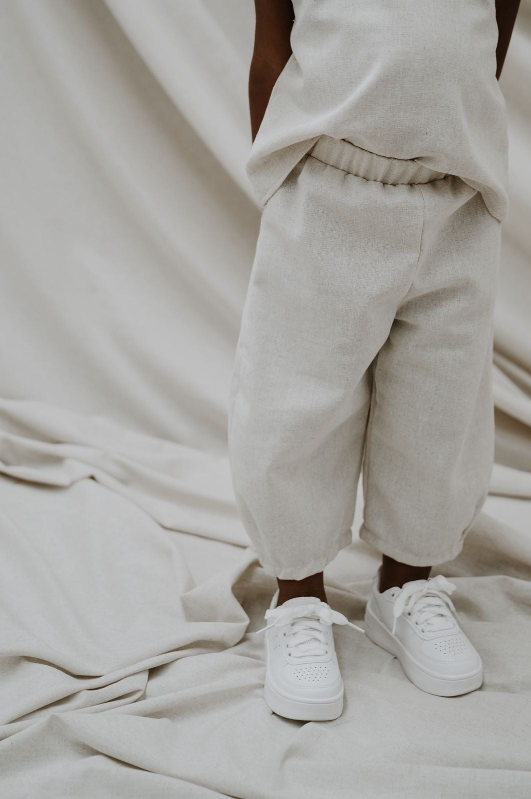 Our favourite – the Tapered Pants. This elasticated, unisex pants is made from a soft cotton-linen blend.
